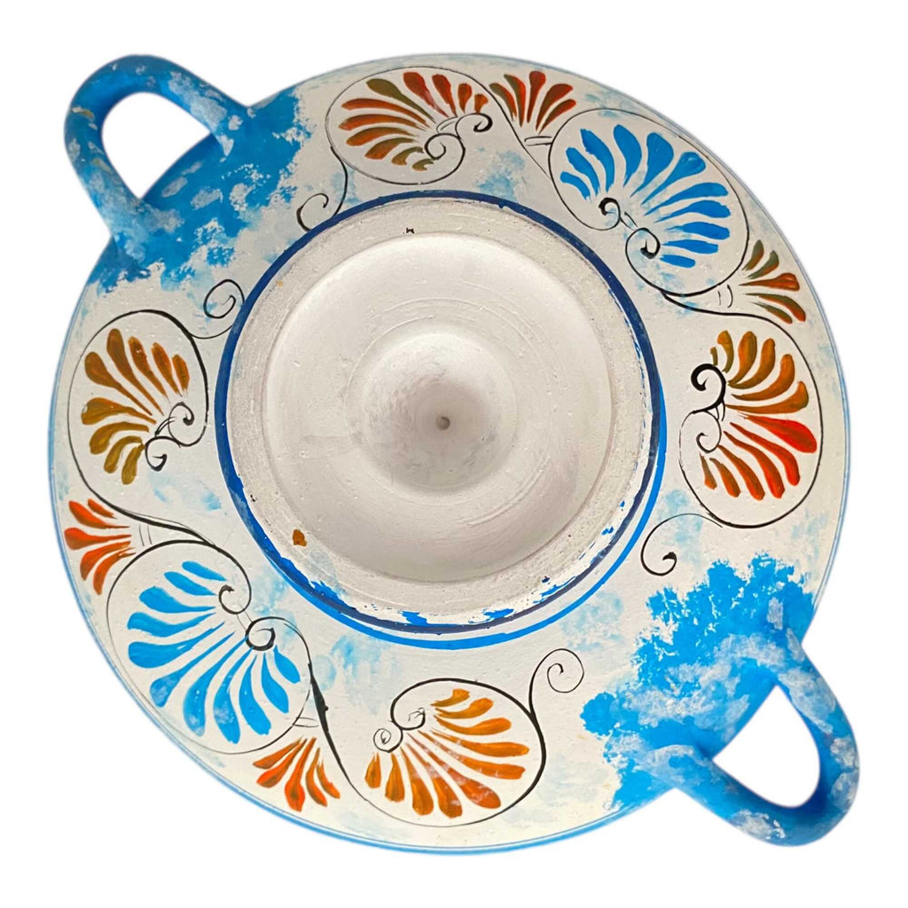 Verschönern Sie Ihre Einrichtung mit einem antiken griechischen Kylix im minoischen Stil. Ein Kylix ist ein altgriechischer Trinkbecher mit einer breiten, flachen Schale und zwei horizontalen Henkeln. Er war oft mit mythologischen Szenen verziert und wurde häufig bei Banketten und Symposien verwendet.